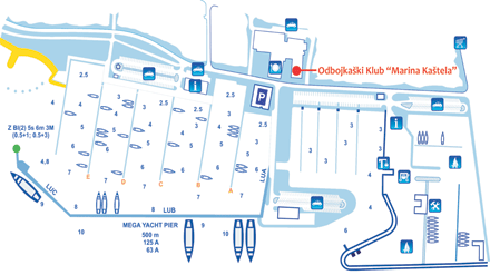 Ulaz u dvoranu nalazi se na istočnoj strani zgrade uprave Marine Kaštela, Šetalište kralja Tomislava b.b.